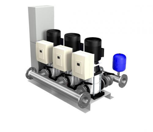 Насосная станция обеспечивает подачу потребителю чистой или технической воды с заданным напором в условиях изменяющейся производительности. В составе станции имеется 1 рабочий и 1 резервный насосный агрегат. В случае неисправности рабочего насоса система управления производит автоматическое переключение на резервный. Поддержание гидравлических параметров реализовано с помощью частотного регулируемого привода насосов по сигналу от датчика давления на напорном трубопроводе насосной станции. Для визуального контроля давления на выходе каждого из насосов установлен манометр. Для устранения гидроударов при пуске и остановке насосов на напорном трубопроводе предусмотрен гидропневмоаккумулятор. Защиту насосов от «сухого хода» обеспечивает реле потока, установленное на всасывающем трубопроводе станции.